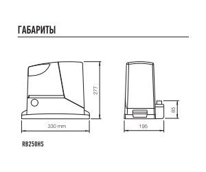 Высокоскоростной электромеханический привод NICE RB250HS для автоматизации откатных ворот массой до 250 кг с шириной проема до 8 м; со встроенным блоком управления, электромеханическим концевым выключателем; интенсивность 50 циклов в час, класс защиты IP44; диапазон рабочих температур от -20°С до +55°С; напряжение питания 230В; напряжение питания двигателя 24В; потребление 2.1А; тип привода электромеханический; габаритные размеры 330х195х277 мм.