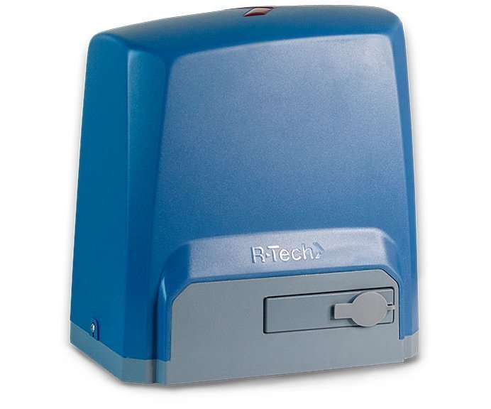 Комплект автоматики для откатных ворот R-Tech SL1000АС.М KIT (привод, 2 пульта 4х канальных, фотоэлементы, лампа сигнальная со встроенной антенной). Тип привода электромеханический. Вес створки — до 1000 кг.; ширина проема — до 12 м ; интенсивность — 35%; скорость — 12 м/мин; модуль шестерни — m4/Z17; напряжение — 230 В; класс защиты IP54.
