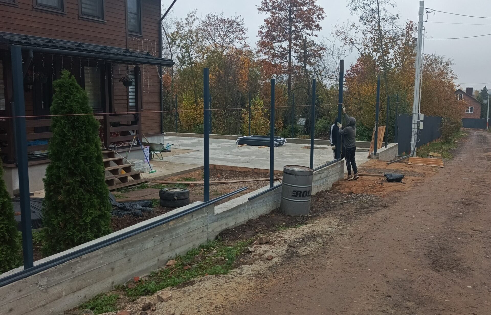 - Фундаменты и столбы: Ленточные фундаменты под забор, кладка кирпичных столбов.